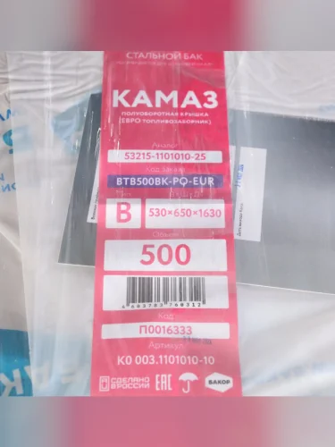 | Наименование | Бак топливный КАМАЗ 500л (530х650х1630) поб (одно отверстие) БАКОР БАКОР btb500bk-po-eur в Горно-Алтайске республике Алтай |
